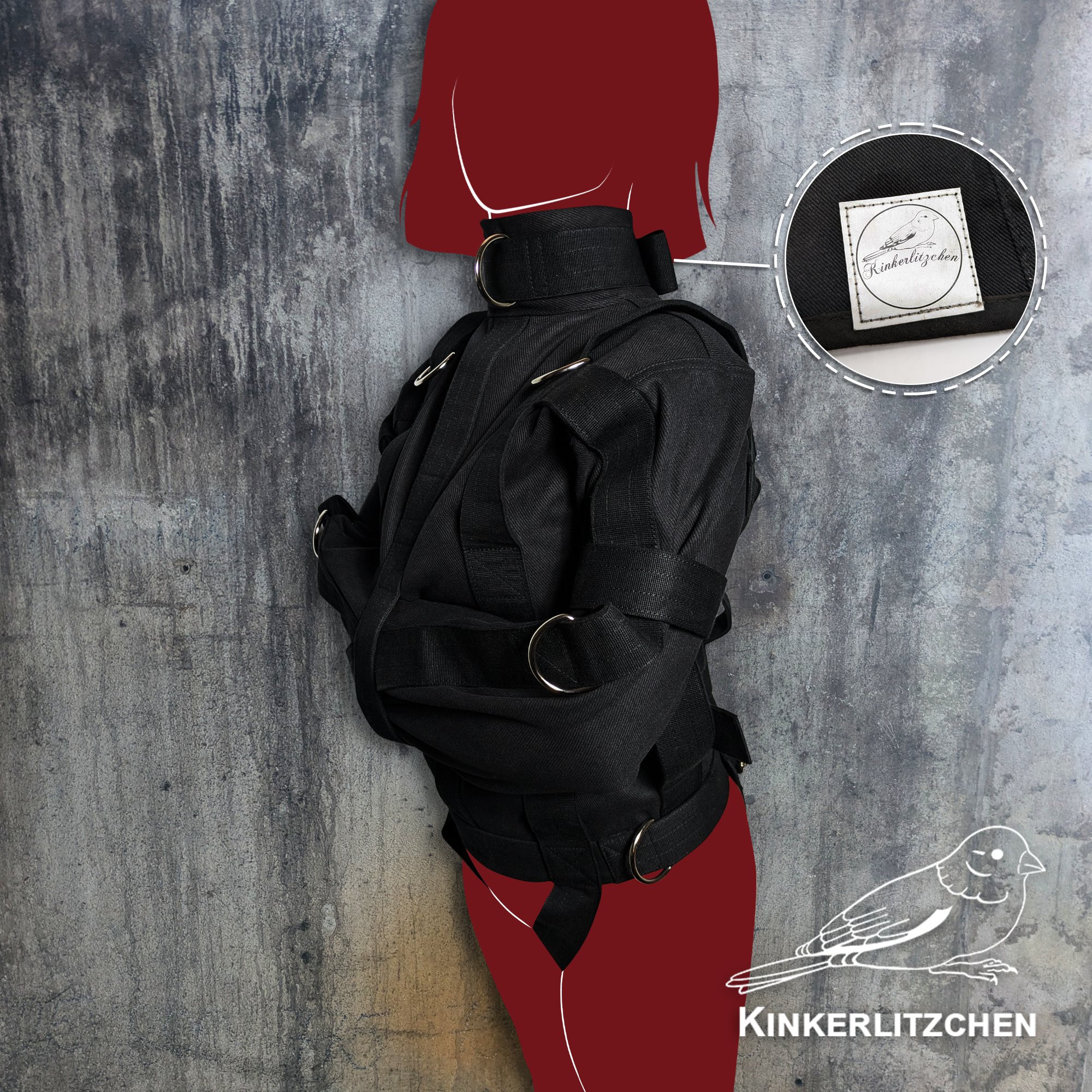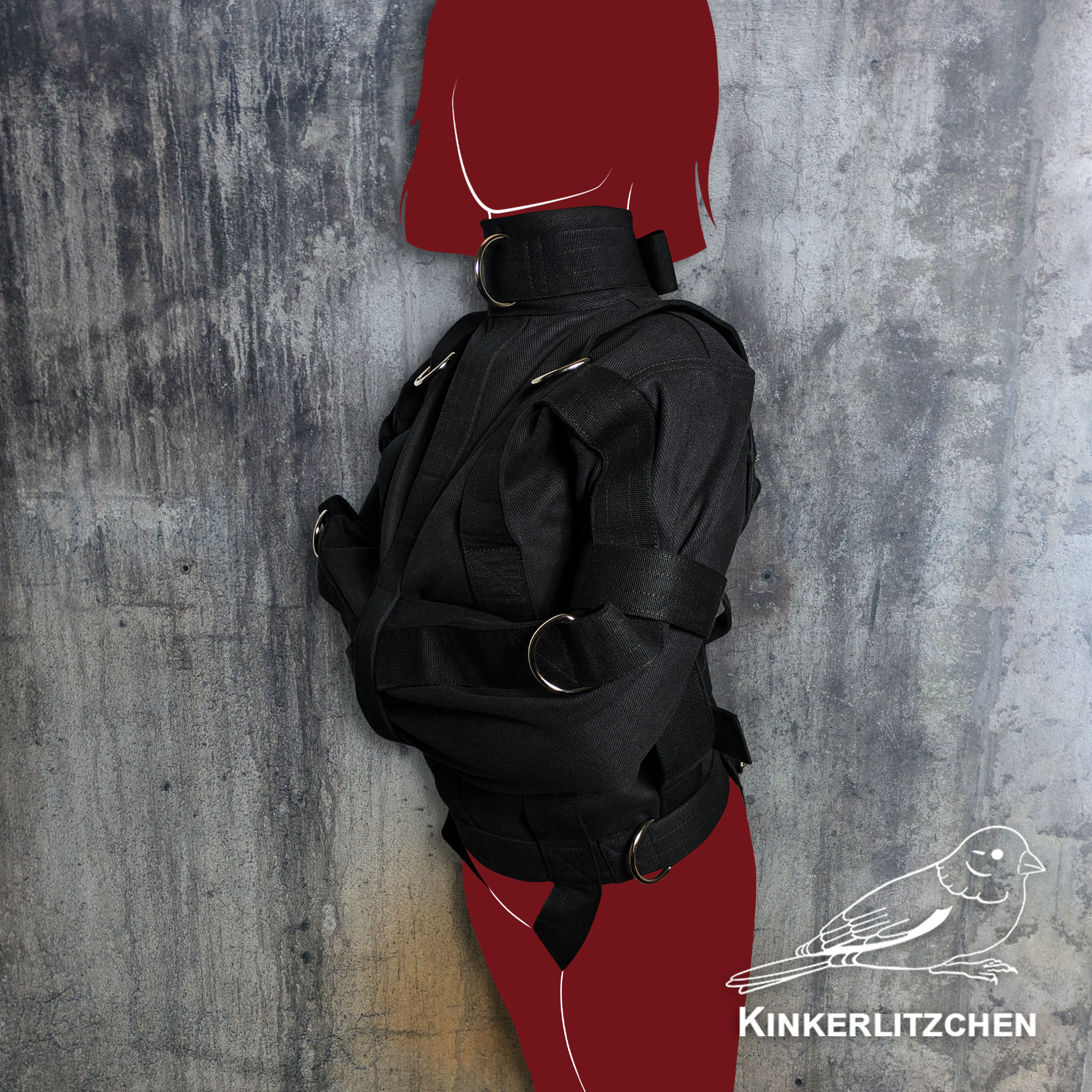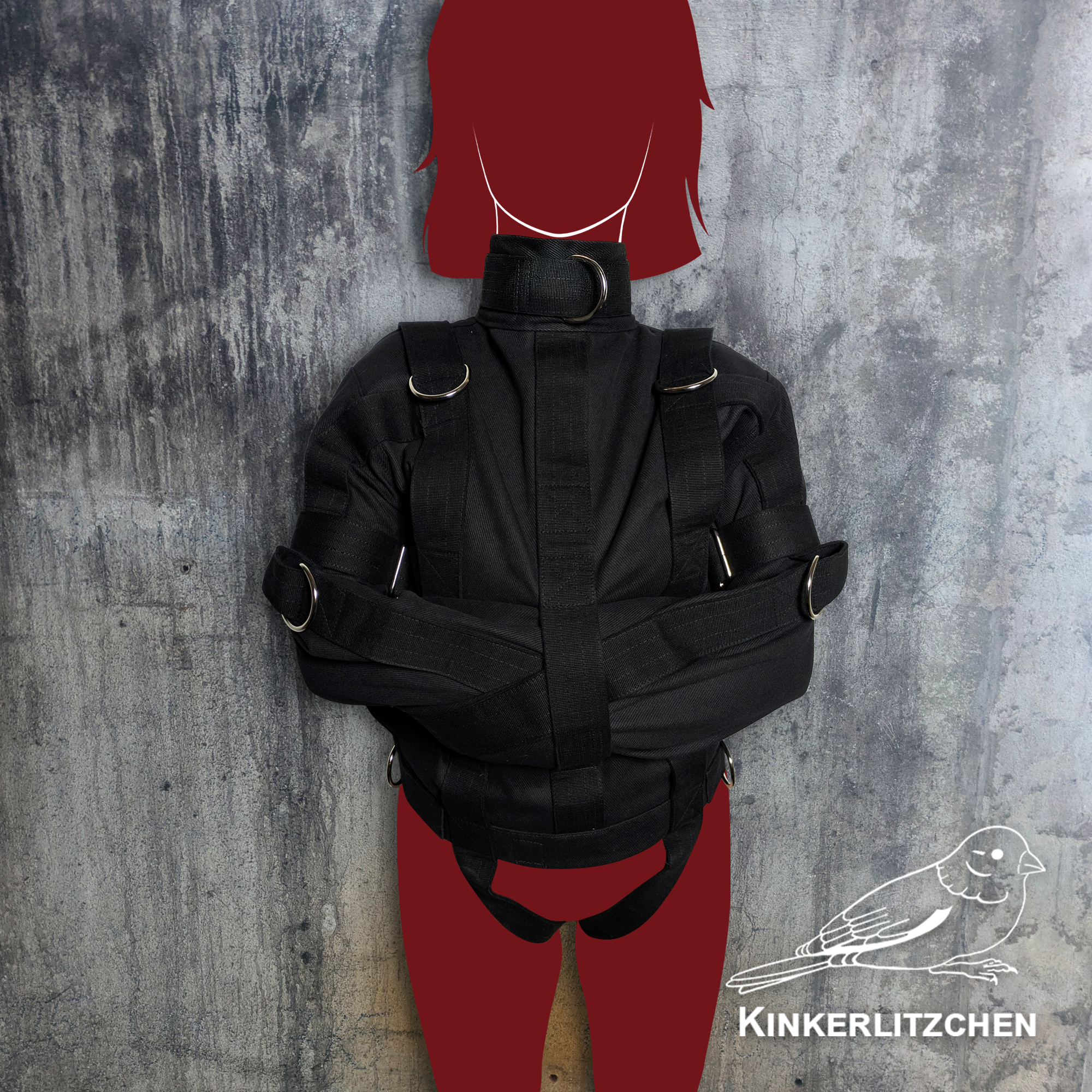 Features multiple sturdy metal rings positioned on the jacket to allow for increased constriction, bondage attachments, or controlled positioning within a scene. These reinforced points expand restraint possibilities while maintaining structural integrity.